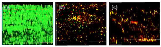Live/Dead biofilm biomass on Ti surfaces contacted with multi-resistant Acinetobacter baumannii (MRAB12) for 7 days (a) as-polished; (b) subjected to NaOH-100Ca + 0.05Ga-heat-water or (c) NaOH-100Ga-heat-water treatment.
