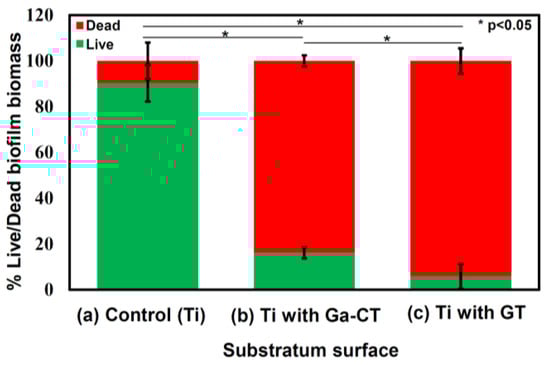 Figure 11 shows the confocal microscopy images of the Ti surfaces containing multi-resistant Acinetobacter baumannii (MRAB12). It was evident that the bacteria proliferated to form dense film on the surface of as-polished Ti, while they were almost entirely killed on the surfaces of Ti with Ga–CT or GT. Quantitative analysis revealed that the percentage of Live biofilm biomass on the control sample was significantly higher (p < 0.05) at 87.7% ± 4% in comparison to both the samples with Ga–CT (16.2% ± 5.5%) and those with GT (5.8% ± 2.9%), as shown in Figure 12. Concurrently, the percentage of Dead biofilm biomass was significantly higher (p < 0.05) on both the samples with Ga–CT (83.8% ± 5.5%) and those with GT (94.2% ± 2.4%).