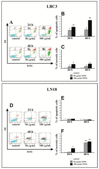 The effect of SiNPs on apoptosis (A,B,D,E) and necrosis (A,C,D,F) of LBC3 (A–C) and LN-18 (D–F) cell lines evaluated by annexin V assay. The cells were incubated for 24 and 48 h in DMEM with 50 and 100 μg/mL of 5–15 nm SiNPs. The cells were double-stained with FITC-Annexin V and PI. Representative dot plots for Annexin V-FITC/propidium iodide (PI) staining are shown (A,D). Following acquisition of sample, the cells were gated through the forward scatter FSC and side scatter SSC and analyzed for fluorescence intensity of FITC-Annexin V and PI. The cells were divided into four subpopulations: live cells—Q3 (annexin V-FITC−/PI−), early apoptotic cells—Q4 (annexin V FITC+/PI−), late apoptotic cells—Q2 (annexin V-FITC+/PI+), and necrotic cells—Q1 (annexin V FITC−/PI+). Percentage of apoptotic cells was the sum of percentage early apoptotic (Q4) and late apoptotic cells (Q2). Mean values of the percentage of apoptotic and necrotic cells, from three independent experiments ± SD are presented. Significant alterations are expressed relative to controls and marked with asterisks. Statistical significance was considered if * p < 0.05 or ** p < 0.001.