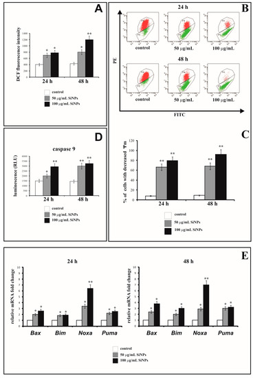 Oxidative stress and biochemical changes induced by 5–15nm SiNPs in LBC3 cells. The cells were treated with 50 and 100 μg/mL of 5–15 nm SiNPs for 24 and 48 h. Intracellular reactive oxygen species (ROS) production in LBC3 cells is presented on panel A. Panel B shows the flow cytometry analysis of ΔΨm in LBC3 cells. The top panel B shows representative dot plots of LBC3 cells analyzed by JC-1 staining. X-axis and Y-axis are green and red fluorescence, respectively. The gate P4—populations of cells with normal ΔΨm and gate P5—population of cells with decreased ΔΨm. The lower panel C shows the percentage of LBC3 cells with decreased ΔΨm. Panel D shows activity of caspase-9 in LBC3 cells. Relative quantification of proapoptotic genes expression in LBC3 cells is presented in panel E. Results are shown as a relative fold change in mRNA expression in comparison to untreated controls, where expression level was set as 1. Significant alterations are expressed relative to controls and marked with asterisks. Statistical significance was considered if * p < 0.05 or ** p < 0.001.