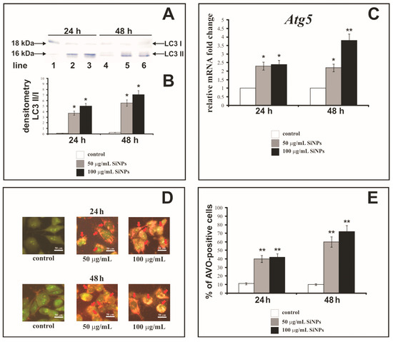 Western blot analysis (A) and densitometric analysis (B) of LC3-I and LC3-II ratio in LBC3 cells incubated in medium with 50 and 100 µg/mL of 5–15 nm SiNPs for 24 and 48 h. Samples containing 20 μg of protein were submitted to electrophoresis and immunoblotting. A representative Western blot is presented on panel A and densitometric analysis—on panel B. Relative quantification of Atg5 gene expression in LBC3 cells (C). Results are shown as a relative fold change in mRNA expression in comparison to untreated controls, where expression level was set as 1. The effect of SiNPs on formation of AVOs in the LBC3 cell lines (D,E) evaluated by fluorescence microscope assay. The volume of the cellular acidic compartment was visualized by acridine orange staining. The cells were incubated in DMEM with 50 or 100 μg/mL of 5–15 nm SiNPs for 24 or 48 h and the cells were photographed under a fluorescence microscope at 200-fold magnification, (scale bar 50 μm) (D), or counted was the percentage of AVOs-positive cells (E). Representative images of AVOs positive cells (red arrows), from one of three independent experiments are shown. Significant alterations are expressed relative to controls and marked with asterisks. Mean values from three independent experiments ± SD are presented; * p < 0.05 or ** p < 0.001.