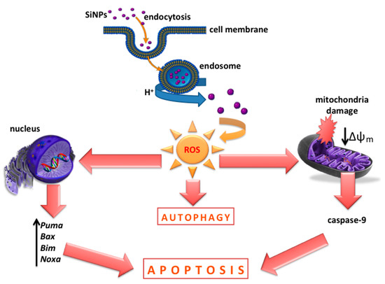 Recently, autophagy has been identified as a novel mechanism induced in cells after exposition to nanoparticles. Autophagy can be triggered by a variety of microorganisms (bacteria, viruses) or parasites. Since NPs may present similar sizes to the microorganisms, they can possibly be perceived as a foreign bodies and cause autophagy activation [25,26,27]. Autophagy can be defined as a cytoprotective mechanism aiming at lysosomal degradation and recycling of proteins and damaged organelles, to maintain cellular homeostasis [27]. However, prolonged and uncontrolled autophagy may cause harmful cellular dysfunction and results in cell death [28]. A growing body of evidence suggests that deregulation of autophagy may also contribute to the toxicity evoked by SiNPs [26,27]. Duan et al. have demonstrated that SiNPs-induced autophagy and endotelial dysfunction in HUVECs cell line occur through the PI3K/Akt/mTOR signaling pathway [26]. The same research group has found that in HepG2 cells, the SiNPs-induced autophagy and autophagic cell death were triggered by ROS generation, suggesting that SiNPs can be a potential factor disrupting cellular homeostasis [27].