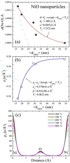 where N is the number of grids along each crystallographic axis and gives a resolution close to the specified value, and V is the volume of the unit cell. Figure 1a,b presents two-dimensional (2D) electron density maps corresponding to the increase in crystallite size from left to right. The demonstrated planes are parallel to the (100) (Figure 1a) and (110) (Figure 1b) crystallographic planes, situated on the plane spacing of 0 and 1 × d, respectively. The (110) plane is situated at a distance of 2.9623, 2.9615, 2.9609, 2.9574, and 2.9574 Å from the origin of the primitive cell, left to right, respectively. The counter color lines are drawn from 0 to 165 e/A−3 at 5 e/A3 intervals. The corresponding Ni–O bond length d(Ni–O) versus the crystallite size <dXRD> of the NiO nanoparticles are shown in Figure 2a, revealing an increase with the decrease in the crystallite size <dXRD>. The red solid curve indicates the fit of the data to the theoretical curve for an exponential function, d(Ni–O) = dL + αexp(–<dXRD>/TO), where dL = 1.089(1) Å, α = 0.005(2) Å, and TO = 17(2) nm represents the initial constant and the fitted parameters, respectively. A slight lattice expansion of 0.184% (percent deviation) was observed from the <dXRD> = 16.6 ± 0.7 nm sample and as the crystallite size <dXRD> decreased further, it approaches the bulk value of ~1.0896 Å, as shown in Figure 2a. The shift is due to a decrease in nickel vacancy concentration as the system approaches stoichiometric NiO with the increase in crystallite size. The 2D maps reveal that mid-bond electron density ρe of Ni–O bond decreases from 0.5744 Å−3 to 0.4957 Å−3 with the decrease in crystallite size <dXRD> due to the symmetric nature of the cubic NiO nanostructure, as can be seen in Figure 2c. The blue solid curve indicates the fit of the data to the theoretical curve for an exponential function, ρe = ρo + βexp(–<dXRD>/T1), where ρo = 0.576(4) e/Å3, β = −0.91(38) e/Å3, and T1 = 6.8(2) nm represents the initial constant and the fitted parameters, respectively. Simultaneously, a mid-bond electron density ρe shifts toward the Ni-atom from 1.0914 Å to 1.0896 Å, which is clearly visible in the one-dimensional charge density profile drawn between the Ni and O atoms, as shown in Figure 2c (one-dimensional electron density ρe distribution along the (100) direction). The 2D Miller maps show the perfectly polar/ionic nature of the Ni–O bond. To search for further quantitative understanding of this effect on the O–O bond, electron density distribution analysis methods were also carried out by calculating the d(O–O) bond length and ρe electron density. The O–O bond also strengthens with annealing temperature, as is evident from the increase in mid-bond electron density from 0.1728 e/Å3 to 0.1939 e/Å3 with crystallite size, which is a further indication of a reduction in interstitial oxygen due to the annealing effect. The values of electron density at bond critical points of all the samples are presented in Table 1, which confirm and quantify the increase in covalent strength of the bond with the crystallite size. With an increase in the annealing temperature, the concentration of both the oxygen vacancies and the interstitial oxygen decreased, providing a green stoichiometric NiO nanopowder. The values of charge density at the Ni and O core are also tabulated in Table 1, showing a maximum value of 164 and 18.9 e/Å3, respectively, for the smallest (19.5 ± 0.6 nm) NiO nanoparticles.