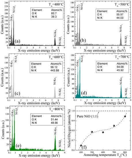 (a–e) Plots of typical EDS spectra taken from various NiO samples; (f) the Ni/O atomic percentage ratio with respect to annealing temperature obtained using EDS.