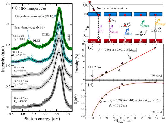 Figure 4a shows the effect of annealing temperatures from 400 °C to 800 °C (bottom to top) on normalized PL spectra of all NiO nanoparticles excited by using 266 nm (~4.66 eV) laser. In pure, stoichiometric NiO nanoparticles synthesized using the microwave combustion method, only emissions related to UV band at 346 nm (~3.58 eV) have been reported [14]. The observed wide range of emissions bands from this set of nanoparticles, extending from the UV to the visible region, confirmed that NiO nanoparticles are highly defective. The PL spectra from all these nanoparticles is dominated by the defect-related, deep-level-emission (DLE) green luminescence at ~520 nm (~2.38 eV), accompanied by a relatively weak and broad near-band-edge (NBE) UV emission at 333–357 nm (3.47–3.72 eV). The UV emission originated from excitonic recombination corresponding to NBE transition of NiO [13], while DLE in the visible region, designated as DLE1 to DLE3, are due to various structural defects such as oxygen vacancies and interstitial defects. The PL spectra in Figure 4a can be deconvoluted using Voigt distribution functions, as shown by the solid line [33]. The corresponding fitting parameters for PL spectra of all the nanoparticles are summarized in Table 2. After deconvolution of PL spectra of 16.6 ± 0.7 nm nanoparticles, five peaks have been categorized as the UV spectrum at 357 ± 1 nm (~3.47 eV), violet at 417 ± 1 nm (~2.97 eV), blue at 459 ± 1 nm (~2.70 eV), green at 523.6 ± 0.3 nm (~2.37 eV), and orange at 604 ± 1 nm (~2.05 eV), respectively. A schematic plot of various PL emission components originating due to electronic transition between different defect levels and the band edge of NiO nanoparticles is given in Figure 4b. A relatively weak and narrow UV emission band is associated with the excitonic recombination of electrons in the conduction band (CB) and holes in the valence band (VB) corresponding to the NBE transition. The violet luminescence peak (DLE1) at 417 ± 1 nm (~2.97 eV) appeared through the possible transition of trapped electrons at Ni interstitial (Nii) to the valence band. The blue luminescence peak (DLE2) at 459 ± 1 nm (~2.70 eV) appeared through radiative recombination of electrons from the doubly ionized Ni vacancy () to the holes in the valence band. The intense green band (DLE) at 523.6 ± 0.3 nm (~2.37 eV) is attributed to nickel vacancies [16]; however, the possibility of origin of green-band emission due to oxygen vacancies cannot be ruled out [12]. Figure 4c shows the variation in intensity of UV band with respect to crystallite size. The solid line represents a linear fit of the data, having a slope of 0.0037 ± 0.0005/nm. Extrapolating linear fit to zero intensity gives a critical crystallite size of 11 ± 2 nm, below which, due to a high surface nickel vacancy concentration, the UV emission will disappear. The similar critical size of ~11 nm has also been predicted from the intensity of the TO phonon mode in our previous report [21]. Figure 4d depicts the exponential dependency of UV emission band gap energy on the crystallite size where the solid line is an exponential decay fit to the data. The fitting parameter yields a critical crystallite size of 10 ± 3 nm with a critical band gap energy of 3.22 eV. When the crystallite size increases, the energy of the UV emission band increases and is saturated at 3.73 ± 0.03 eV, which is close to the NBE value corresponding to bulk NiO, varying between 3.6 to 4.0 eV [34,35,36,37]. The suppressed UV band emission energy observed with the decrease of crystallite size can be attributed to the weakened covalent Ni–Ni and ionic Ni–O bonds, as observed from electron density analysis. Kisan et al. [13] reported a similar value of band gap energy, ~3.45 eV (for 16.6 ± 0.7 nm, Eg ~ 3.47 meV) but with enhanced intensity for ~15 ± 1 nm size of stoichiometric NiO nanoparticles without any emission in the visible region. In their work further reduction of crystallite size down to ~10 nm showed a blue shift in UV emission due to the quantum confinement effect. The observed phenomenon in this set of NiO nanoparticles contradicts the quantum confinement effect observed in stoichiometric NiO nanoparticles. Furthermore, in large particles, the emission energy of blue emission band shifts to higher energy, 451.3 ± 0.2 nm (~2.75 eV), whereas the violet emission band shifts to lower energy, 430 ± 2 nm (~2.88 eV). An increase in crystallite size to 54 ± 6 nm resulted in a relatively intense UV band with a band gap energy shift to 333.2 ± 0.2 nm (~3.72 eV). NiO has a complex band structure with multiple valence (3d band of Ni2+ and 2p band of O2−) and conduction (4s band of Ni2+ and 3s band of O2−) bands. In general, the stronger the band–band PL intensity of NiO nanoparticles, the higher the recombination rate of the photoinduced electron-hole pair. The deeply trapped holes are more or less localized, exhibiting a lower oxidizing potential [38,39]. Thermal annealing treatment may result in a slight deviation from NiO stoichiometry and the cation vacancy and/or interstitial oxygen trapping in the NiO lattice leads to a main DLE peak at 523.6 ± 0.3 nm (~2.37 eV) in the green emission band that confirmed the presence of such defects in the NiO lattice. Nickel vacancies can be produced due to the charge transfer between Ni2+and Ni3+ [40]. The PL intensity of broad near-band-edge (NBE) UV emission at 333–357 nm (3.47–3.72 eV) is enhanced with an increase in the electron density, as seen in Figure 2b, because of the increase in the crystallite size. Therefore, small particles having high nickel vacancies on the surface (that is, a low electron population in the valence band) when excited will result in reduced intensity due to a suppressed electron hole recombination process. On the other hand, in thermal annealing processes, enhanced intensity UV band emission will be observed in large particles due to an increased electr
