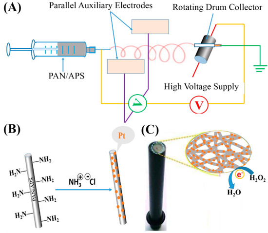 (A) Model of a home-made electrospinning instrument for the synthesis of polyacrylonitrile/3-aminopropyltriethoxysilane (PAN/APS) hybrid nanofibers; (B) Electrostatic assembly mechanism of platinum nanoparticles (PtNPs) along amino-modified PAN nanofibers; (C) PAN–PtNPs hybrid nanofibrous membrane-modified electrode and the potential sensing mechanism of H2O2.