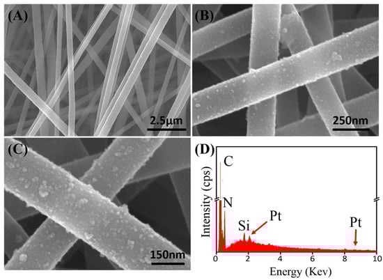 Electrospinning is a simple and effective technique to create PMNFs. In this work, we found that the introduction of APS into the PAN solution did not affect the formation of uniform PAN nanofibers, which is proved firstly by the scanning electron microscopy (SEM) characterization. Figure 2A shows the typical SEM image of the electrospun PAN/APS hybrid nanofibers, which reveal high uniformity and linear structure with a diameter of a few 100 nm. After the electrostatic assembly of PtNPs along the fabricated PAN/APS nanofibers, it can be found that the resulted PAN–PtNPs hybrid nanofibers kept the original structure, similar to the PAN/APS nanofibers (Figure 2B), which exhibits a uniform diameter in the range of 200 to 300 nm and is decorated with many PtNPs. A further magnified SEM image (Figure 2C) indicates that the PtNPs were adsorbed uniformly on the surface of electrospun PAN/APS nanofibers due to the electrostatic self-assembly of PtNPs along PAN nanofibers. To identify the successful conjugation of PtNPs along PAN nanofibers, we utilized an energy dispersive X-ray detector (EDX) spectrum to detect the main elements of the final PAN–PtNPs hybrid nanofibers. As shown in Figure 2D, four elements, C, N, Si, and Pt, could be found in the electrospun nanofibers. In particular, two characteristic peaks of Pt (2.2 and 9.4 keV) in the EDX spectrum clearly prove the existence of PtNPs, as well as identify that the electrostatic assembly strategy is effective for creating PAN–PtNPs nanofibrous membrane [35]. In addition, further calculation indicated that the Pt element is about 5.61% of the whole amount of hybrid nanofibers, exhibiting a high density of PtNPs on the surface of PAN nanofibers.