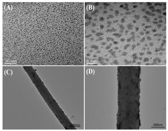 (A,B) High-resolution transmission electron microscopy (HRTEM) images of the synthesized negative-charged PtNPs; (C,D) TEM images of electrospun PAN–PtNPs with different magnifications.