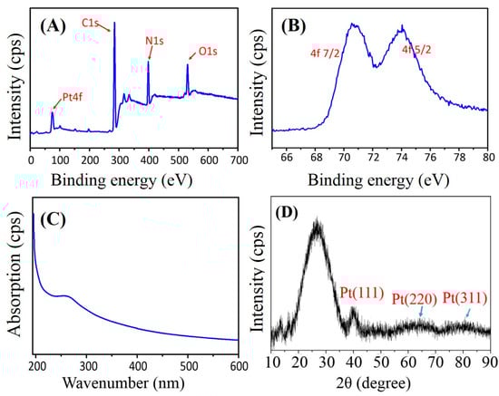 Structural characterizations of electrospun PAN–PtNPs hybrid nanofibers: (A,B) X-ray photoelectron spectrum (XPS) spectra; (C) UV–Vis spectrum, and (D) XRD pattern. Cps means counts per second.