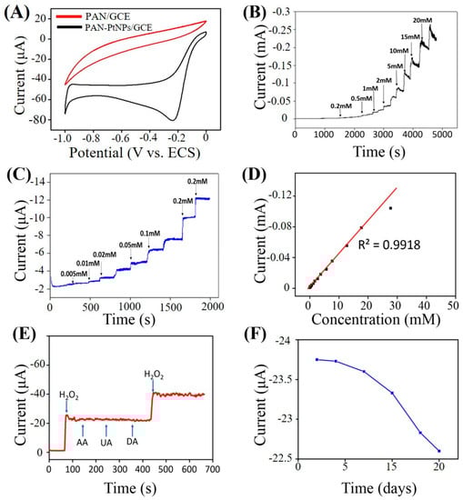 PAN–PtNPs/glassy carbon electrode (GCE) for sensing test (scan rate: 50 mV/s, PBS, PH = 7.4): (A) Typical cycle voltammetry (CV) curves of both PAN/GCE and PAN–PtNPs/GCE; (B,C) Current-time (I-T) response of PAN–PtNPs/GCE with different detection ranges; (D) Corresponding linear current-concentration relationship; (E) Selectivity; and (F) Stability.