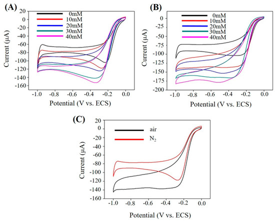 PAN–PtNPs/GCE for sensing test (scan rate: 50 mV/s, PBS, PH = 7.4): (A) Typical CV curves of PAN–PtNPs/GCE with different H2O2 concentrations under N2 atmosphere; (B) Typical CV curves of PAN–PtNPs/GCE with different H2O2 concentrations under air atmosphere; (C) Corresponding CV curves with the same H2O2 concentration under air and N2 atmosphere.