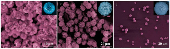SEM images of (a) Co/BDC MOF fabricated with the solution concentration is 0.21 mol·L−1; (b) Co/BDC ICP fabricated in the solution concentration is 0.104 mol·L−1; (c) Co/BDC ICP sprayed in the reverse order. The inserts are the individual microparticles respectively.