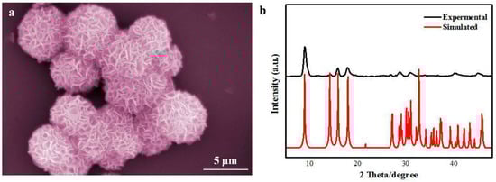 SEM images (a) and XRD (b) of Ni-Co/BDC MOF microparticles fabricated in the solvent of the ternary mixture. The structure of the simulated 3D reference was shown in Figure S4.