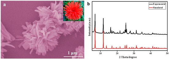 SEM images (a) and XRD (b) of Zn/DOBDC MOF microparticles fabricated in the solvent of the ternary mixture. The structure of the simulated 3D reference was shown in Figure S5. The insert in (a) is a natural chrysanthemum.