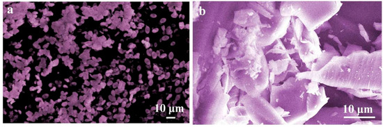 In our further in-depth experiments, the spray technique can be proven to play a key role in the formation of the flower-like structure. When the solutions of metal ion and organic ligands were mixed by other means, such as pouring or dropping, the corresponding CP materials could be obtained, whereas the flower-like structures disappeared. For example, the dropwise addition of the Co2+ions into the ternary solvent solution of H2BDC and the DMF solution of H2BDC produced granule MOF particles (Figure 8a) and irregular ICP bulks (Figure 8b), respectively. The fabrication of such flower-like structures could be separated into two stages: generation of the nanosheets petals and crossing assembly of the resulting petals into a flower. Directly mixing the solutions of metal ion and organic ligands could not prepare the nanosheets, not to mention the following assembly. However, spray technique could match the fabrication conditions. As shown in Scheme 1, initially, due to the gentle touch, spraying the nebulized metal ion solution onto the surface of the organic ligand solution could give rise to a steady interface. At the interface, the CP was inclined to grow in the lateral direction, which led to the formation of the nanosheets. Subsequently, the resulted nanosheets aggregated in the zone of the droplets due to its low diffusion rate, which induced the assembly of the nanosheets’ “petals” into the individual “flower”. Although some fundamental issues including the details of the assembly process and the exact driving force cannot be clearly interpreted yet in this work, the spray technique with the practicality and efficiency has made itself a promising candidate for building up flower-like structures.