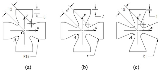 Here the variables chosen to perform the Hammersley optimization algorithm of the specimen are the distance l, the radius r and the distance d, as shown in Figure 1. The values of these parameters are assumed to be varying as follows , , and , all dimensions are in millimeters. The objective function consists of minimizing the strain difference between point A and the central point O of the specimen, shown in Figure 1, in order to have a uniform strain sample state. For illustrative purposes, Figure 1a shows the sample geometry when , and , while Figure 1c shows the geometry when , and .