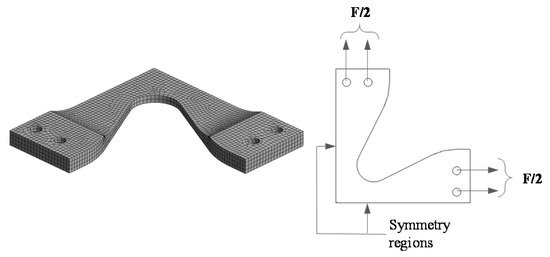 Here, the finite element method (FEM) is used to obtain the sample strain field. In this case, and based on the sample geometry, only a quarter of the specimen is considered, as illustrated in Figure 2. A higher order, three-dimensional, 20-node hexahedron solid element that exhibits quadratic displacement behavior is used. The element is defined by 20 nodes having three degrees of freedom per node: translations in the nodal x, y, and z directions. The FEM model contains 27,168 nodes and 7103 nonlinear elements. The incompressible material constitutive model that describes the mechanical behavior of this element is assumed to be of hyperelastic nature, therefore, this FEM model admits large element deflection and strains [20].