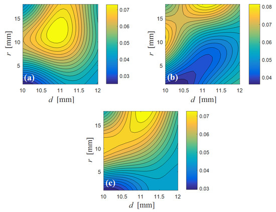 In this case, to have a cubic response material function that is a function of the first invariant . With these assumptions, the FEM simulations provided the surface response charts shown in Figure 3. These three response surfaces of the strain difference considering variations of r and l were plotted by assuming: (a) mm, (b) mm, and (c) mm. Here, the response surfaces were obtained from the design of experiments with central composite design in combination with the surface response meta-modeling Kriging algorithm [18].