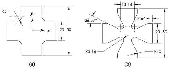 - Makris, A.; Vandenbergh, T.; Ramault, C.; Van Hemelrijck, D.; Lamkanfi, E. Shape optimisation of a biaxially loaded cruciform specimen. Polym. Test. 2010, 29, 216–223. [Google Scholar] [CrossRef]