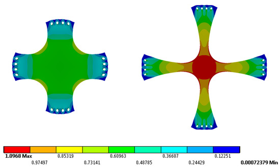 The equivalent strain fields shown in Figure 5 are numerically obtained when a force F of magnitude 1.48 N is applied in both the original and optimized specimen dimensions. There is a significant increase in the uniform strain fields in the sample with the optimized geometry that allows performance of equibiaxial experimental tests at larger sample elongations.