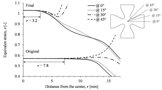 Comparison of equivalent strain values between the original and final specimen geometry along 0°, 15°, 30°, and 45° specimen paths.