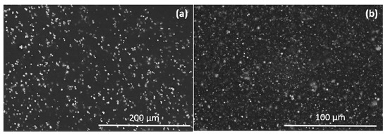 To observe the magnetic particles dispersion into the polymeric matrix, scanning electron microscopy (SEM) was performed, using a Quanta 250-FEG FEI (San Luis Potosí, México) operated at 5 kV with an opening of 86 pA. The SEM images of Figure 7 shows a uniform dispersion of iron micro- and nanoparticles and therefore the composite materials are considered to be isotropic [26].