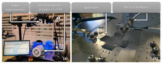 Biaxial test rig configuration, (a) video extensometer and linear actuators and (b) specimen and force transducers.