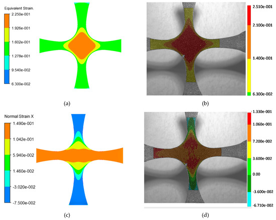 Strain field comparison between the numerically calculated results and those measured experimentally. The applied load is 0.48 N with a preload of 1 N in both x and y directions. Plots (a,b) show the equivalent strain contours comparison and plots (c,d) depict the contours of normal strain in x direction.