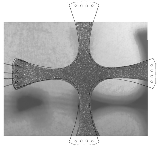 Figure 10 shows the deformed specimen profile obtained from the equibiaxial ElectroForce LM1 TestBench system overlaid with the numerically obtained deformed specimen’s silhouette. During the FEM simulation analysis, two kinds of nonlinearities were considered, one due to the material nonlinearities, and the second related to large deformations to which the higher order, three-dimensional, 20-node solid elements used in the FEM analysis are subjected. This will help us to obtain more accurate results to assess the behavior of the composite material specimens under equibiaxial loadings.