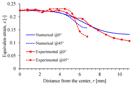 The quantitative comparison between the numerical and experimental values is shown in Figure 11, in which only the strain magnitude along the paths at 0° and 45° were plotted. Based on the FEM numerical results and from the DIC experimental data, it is evident from Figure 11 that both plots agree well in the equibiaxial interval where the maximum relative error between both procedures does not exceed of 5%.