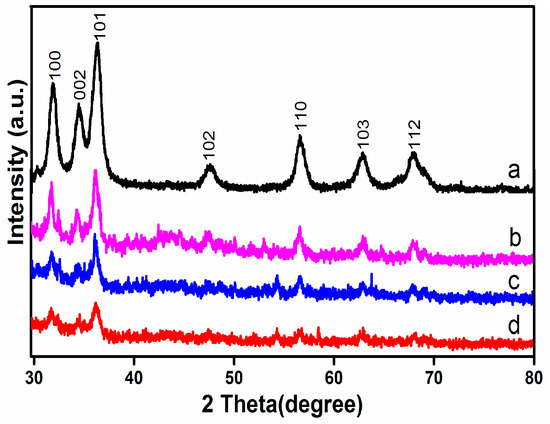XRD patterns of Ag-N-ZnO (a), Ag-N-ZnO/CHAC (b), Ag-N-ZnO/CAC (c), and Ag-N-ZnO/AAC (d).