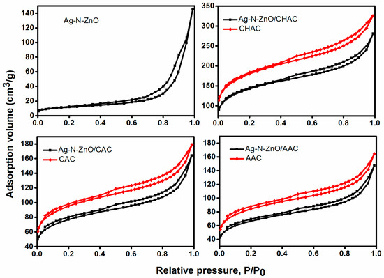 N2 adsorption/desorption isotherms curves of Ag-N-ZnO, Ag-N-ZnO/CHAC, Ag-N-ZnO/CAC and Ag-N-ZnO/AAC.
