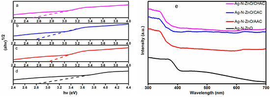 Direct band gap of (a) Ag-N-ZnO/CHAC, (b) Ag-N-ZnO/CAC, (c) Ag-N-ZnO/AAC (d) Ag-N-ZnO and (e) UV-vis diffuse absorption spectra of all photocatalysts.