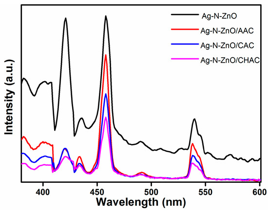 PL spectra of Ag-N-ZnO, Ag-N-ZnO/CHAC, Ag-N-ZnO/CAC and Ag-N-ZnO/AAC.