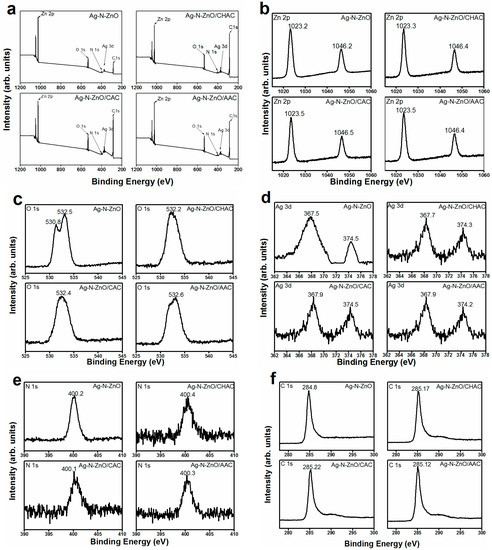 XPS spectra of survey spectra (a) Zn 2p (b), O 1s (c), Ag 3d (d), N 1s (e) and C 1s (f) levels of Ag-N-ZnO, Ag-N-ZnO/CHAC, Ag-N-ZnO/CAC and Ag-N-ZnO/AAC.