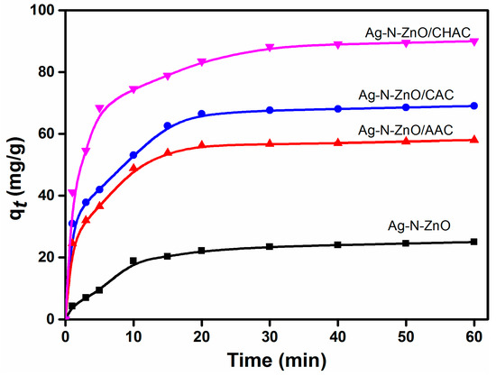 The adsorption kinetic curves of four composite photocatalysts were researched (Figure 6). It can be found that the four photocatalysts have similar adsorption behaviors. The adsorption process undergoes two steps: MO is rapidly adsorbed onto the photocatalyst surface within the first 10 min period. At the second step, the adsorption rate becomes slower until the adsorption equilibrium is reached because the number of available active sites gradually decreased. The adsorption process can almost reach equilibrium in about 60 min. Among these photocatalysts, Ag-N-ZnO/CHAC composite photocatalyst exhibits the highest amounts of adsorption due to its large specific surface area [10].