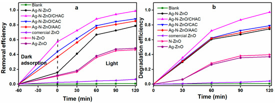 The photocatalytic performance of the different prepared photocatalysts was estimated by the degradation of MO under visible light irradiation after dark adsorption for 60 min (Figure 7a). A blank experiment was carried out under visible light irradiation for 120 min in the absence of photocatalysts, which indicated that the direct photolysis of MO could be negligible under visible light irradiation. The commercial ZnO exhibits virtually no activity under visible light irradiation. Compared with commercial ZnO, the photocatalytic activity of Ag-ZnO and N-ZnO were enhanced. This phenomenon is due to the fact that Ag can act as an electron scavenger to trap the photogenerated electrons, thereby decreasing the recombination rate of electron-hole pairs [24]. Moreover, N doping can provide an impurity energy level above the valence band of ZnO, thereby responding to the visible light and reducing the band gap [37]. The photocatalytic activity of Ag-N-ZnO is higher than single-doped ZnO, which is attributed to intense visible light absorbance and a lower recombination rate of electrons and holes [38]. The Ag-N-ZnO loaded on AC exhibited a better photocatalytic degradation efficiency compared with pure Ag-N-ZnO. This result is reasonable on the basis of the two following factors: (1) The smaller particle size has more active sites at a constant amount of photocatalyst, which leads to an increase in the adsorption of O2 and –OH, hence the generation of radicals is increased [23] and (2) AC may contribute to MO molecules gathered around Ag-N-ZnO particles in low concentration solution of MO [10]. These factors resulted in high photocatalytic activity. Among the all composite photocatalysts, the Ag-N-ZnO/CHAC exhibits the highest photocatalytic activity and the degradation efficiency of MO reached 98.82% within 120 min under visible light radiation. Moreover, when the adsorption of the photocatalyst was eliminated, the degradation efficiency of MO can still reach 97.23% within 120 min under visible light radiation (Figure 7b). This is due to three reasons: (1) The particle size of Ag-N-ZnO/CHAC is the smallest, which is in favor of adsorption of O2 and –OH to generate ·OH and ·O2− [23]; (2) The surface area of Ag-N-ZnO/CHAC is the largest, which may contribute to more MO molecules gathering around Ag-N-ZnO [10]; and (3) The intensity of the PL of Ag-N-ZnO/CHAC is the weakest, which indicates a decrease in the recombination rate of electrons and holes, thus increasing the life of electrons and holes [26]. These factors resulted in a highest photocatalytic activity of Ag-N-ZnO/CHAC.