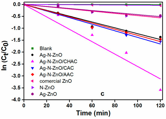 Furthermore, the photodegradation kinetics of MO on the four composite photocatalysts were investigated (Figure 7c). The kinetic curves of various photocatalysts follow First order kinetics and the degradation rate constants of all samples are presented in Table 3. The apparent rate constant of photocatalyst is in the following order: Ag-N-ZnO/ACs > Ag-N-ZnO > N, or Ag single-doped ZnO > commercial ZnO, which indicated that N, and Ag co-doped ZnO supported on AC can enhance the photacatalytic activity of the photocatalyst. Ag-N-ZnO/CHAC achieved excellent photocatalytic performance with a k value of 0.0260 min−1, which was 2.11 times that of Ag-N-ZnO (k = 0.0123 min−1).