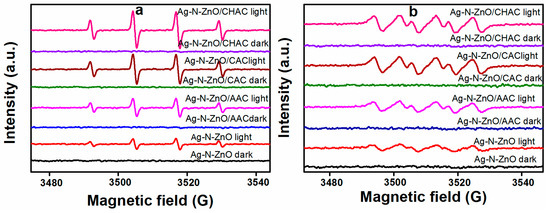In order to detect the involvement of radical species generated in the photocatalytic process, the ESR spin-trap with DMPO technique has also been performed on illuminated photocatalysts [39]. The results are displayed in Figure 8. Dark treatment experiments show that no signals (·OH and ·O2−) were detected in the presence of photocatalysts. As shown in Figure 8a, under visible light irradiation, the signals of DMPO-·OH for all samples can be clearly observed, and the intensity increases with the addition of AC. This finding is further defined by the formation of ·OH during the process of photocatalytic degradation of dyes in the presence of photocatalysts and visible light irradiation. Moreover, the superoxide radical (·O2−) was observed, as displayed in Figure 8b. When photocatalysts were irradiated with visible light, Ag-N-ZnO/CHAC could generate stronger and more obvious peaks of the DMPO-·O2− species than other samples, indicating that Ag-N-ZnO/CHAC can generate more ·O2− radicals. In particular, under identical operational conditions, the Ag-N-ZnO/CHAC composite photocatalyst exhibits the strongest intensities of ·OH and ·O2−, which seems consistent with the more efficient charge separation and transfer from Ag-N-ZnO/CHAC as investigated by the above photoluminescence (PL) spectrum analysis. The smaller particle size of Ag-N-ZnO/CHAC could facilitate the rapid diffusion of photogenerated carriers to the semiconductor surface, resulting in a decrease of the recombination rate of the carrier. Therefore, more electrons and holes can react with O2 and –OH to form ·OH and ·O2−, respectively, resulting in stronger intensities of ·OH and ·O2−. This result is in strong agreement with photocatalytic activity.