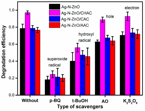 The removal rate of MO over Ag-N-ZnO/ACs in the presence of various scavengers.