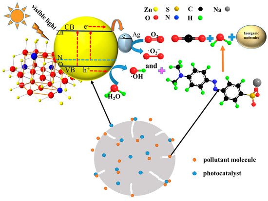 The enhanced photocatalytic activity of the Ag-N-ZnO/AC composite photocatalyst can be understood as follows and the possible mechanisms are illustrated in Figure 10. As the photocatalyst is irradiated by visible light, ZnO is activated to produce the photogenerated electrons and holes. Then the photogenerated electrons and holes react with O2 and -OH, respectively, to form ·OH and ·O2−. The MO is then decomposed by ·OH and ·O2−. The high photocatalytic activity of the Ag-N-ZnO/AC photocatalysts under visible light may be attributed to N and Ag dopants as well as to the AC. Firstly, this phenomenon is achieved by substituting O sites with N, which can form impure energy levels. Thus, electrons transfer from the valence band (VB) to the N 2p and from the N 2p to the conduction band (CB), inducing a longer wavelength of the absorbed photon [13]. Secondly, the photogenerated electrons excited by visible light were trapped by Ag after they were transferred to the conduction band of the prepared composites, which prevented their recombination with holes [35]. Thirdly, AC acts as a barrier to the inhibitive action of ZnO crystal growth, which increased the surface of contact between MO and the photocatalyst. AC could absorb a large part of irradiation, which traded off its advantage as an adsorptive support to concentrate MO molecules. Some hot-spots could be formed on the surface of the AC particles, and the MO molecules around the “hot spots” could be decomposed in the presence of O2 dissolved in water [24]. These factors all resulted in the high photocatalytic activity of the Ag-N-ZnO/AC composite photocatalyst.