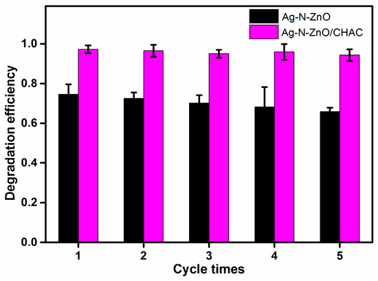 In addition to photocatalytic properties, the stability and recyclability of the photocatalyst are important for its potential application. To evaluate the stability of the photocatalyst, the photocatalytic degradation of recycled photocatalysts was carried out under visible light irradiation. The photocatalyst was collected after the photocatalytic reaction, then washed with distilled water and ethanol and dried in an oven at 80 °C before reuse. As shown in Figure 11, theAg-N-ZnO/CHACphotocatalyst retained its high photocatalytic activity, and still the degradation efficiency of MO reached 94.32% after five recycle runs. The photocatalytic activity of Ag-N-ZnO/CHAC only minimally decreased, which could be due to three reasons: (1) The pore of the composite photocatalyst were blocked resulting in the decrease of the ability of photocatalyst to concentrate MO molecules; (2) The photocatalyst was lost during the cycle processes; and (3) The partial active sites were deactivated or blocked due to not complete degradation of MO and MO intermediates during each previous cycle. The degradation efficiency of MO over Ag-N-ZnO decreased from 74.6% to 65.88% after five recycle runs. This phenomenon is mainly attributed to a higher loss of Ag-N-ZnO photocatalysts during the difficult separation processes. These results indicate that AC as supported materials can not only improve photocatalytic activity, but also improve the stability of the photocatalyst.