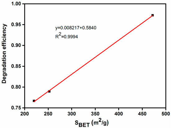 It is important to study the correlation between the physical and chemical properties of the photocatalyst and its degradation properties. Figure 12 shows that the SBET of Ag-N-ZnO/ACs presented a good positive correlation with MO removal rate (R2 = 0.9994). A large specific surface area of the photocatalyst will result in a high removal rate of MO. This result is consistent with those obtained above. Therefore, the best photocatalytic degradation of MO was observed over Ag-N-ZnO/CHAC.