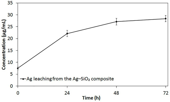 Inductively coupled plasma-optical emission spectrometer (ICP-OES) was utilized to identify the prolonged Ag release from the Ag–SiO2 composite. The total concentration of Ag in the non-filtered stock of Ag–SiO2 composite (1 mg/mL) is 57.8 10.4 μg/mL (100%). The in vitro leaching profile of Ag from the filtered Ag–SiO2 composite as the function of time is shown in Figure 3. At the start of the experiment (0 h), the filtration of the stock suspensions had resulted in 7.5 1.2 μg/mL Ag concentration, which represents ~13% of the stock Ag concentration. After 24 h, Ag was quickly leached from the composite with a concentration of 22.1 2.3 μg/mL (~38.2%). Then, a slower sustained leaching of Ag was detected, as the concentrations of 27.1 2.4 μg/mL (~46.9%) and 28.4 2.2 μg/mL (~49.1%) were detected after 48 and 72 h, respectively. A possible explanation for the subsequent slower sustained release of Ag is the depletion of the immobilized Ag NPs from the surface of SiO2 particles.