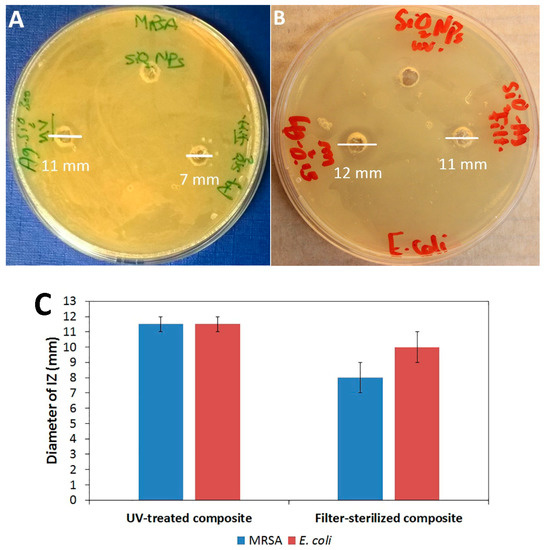 Antibacterial effects of UV-treated and filter-sterilized Ag–SiO2 composites detected by the diameters of inhibition zones (IZs) on plates with (A) MRSA and (B) E. coli. (C) The diameters of IZs. The averages and standard errors of two independent agar diffusion assays are shown.