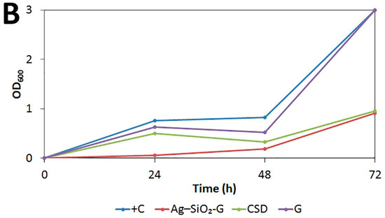 The antimicrobial agar susceptibility tests were performed according to the recommendations of the Clinical and Laboratory Standards Institute (CLSI) [67]. An aliquot of 100 μL of each bacterial suspension of 1 to 2 108 colony-forming units (CFU)/mL was spread on the MHA plates. Then, 100 μL of the Ag–SiO2 and SiO2 solutions tested were dispensed into the 5 mm-diameter wells of the plates. The agar diffusion assays were performed in duplicate and parallel agar diffusion assays were performed for the filter-sterilized Ag–SiO2 composite. The diameters of IZs (mm) were measured after overnight incubation at 37 °C.