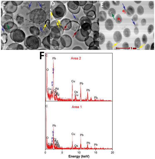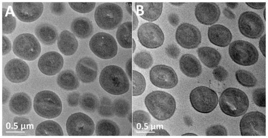 In order to identify the possible mechanisms of antibacterial effects of the composite, MRSA was treated with the Ag–SiO2 composite and the pristine SiO2 particles for morphological observations using TEM and X-ray microanalyses using STEM. Untreated MRSA was utilized as a negative control. MRSA was cultured in LB broth (1 to 2 108 CFU/mL) with shaking (200 rpm) at 37 °C overnight. Aliquots of 500 μL of the Ag–SiO2 and SiO2 solutions were added to the bacterial suspensions, and the incubation was continued for 24 h. The bacterial cells were centrifuged and washed, and further processed by fixation (first in 2.5% glutaraldehyde in 0.1 M sodium cacodylate buffer at 4 °C for 24 h, then with 1% osmium tetroxide at room temperature for 1 h), dehydration, infiltration, and polymerization, as previously reported [59]. Following polymerization, the epon blocks were cut into 60 nm thick sections, using a Leica ultramicrotome (EM Ultra Cut UC6ei, Leica Mikrosysteme GmbH, Vienna, Austria). The sections were drop-cast on grids (formvar-coated 200-mesh EM copper grids, Electron Microscopy Sciences, Hatfield, PA, USA) and first stained with 0.5% uranyl acetate, then with 3% lead citrate.