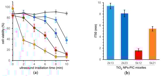 Cell-killing effect of TiO2 NP-PIC micelles under ultrasound irradiation. (a) Effect of ultrasound irradiation time on viability of HeLa cells treated with TiO2 NP-PIC micelles. (b) Half maximal inhibitory time of ultrasound irradiation (IT50) of TiO2 NP-PIC micelles. 2k13, 2k26, 5k12, and 5k21 micelles and without the micelles are represented by light blue, blue, orange, red, and gray symbols, respectively. Ultrasound irradiation was performed for varying times (frequency: 1.0 MHz; power: 0.5 W/cm2; duty cycle: 10%).
