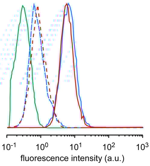Flow cytometry analysis of 1O2 generation of TiO2 NP-PIC micelles (red line, 5k12 micelles; light blue line, 2k13 micelles) with (solid line) and without (dashed line) ultrasound irradiation. (frequency: 1.0 MHz; power: 1.0 W/cm2; irradiation time: 2 min; duty cycle: 10%).