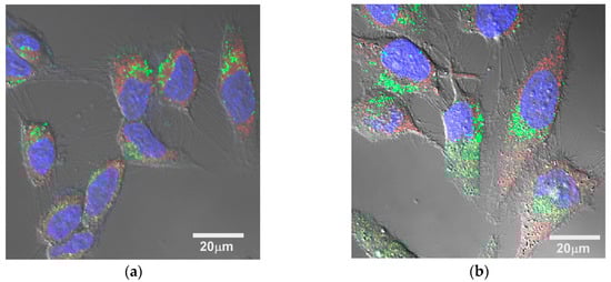 Confocal laser scanning microscopy images overlaid with differential interference contrast images of HeLa cells treated with (a) 2k13 and (b) 5k12 micelles for 24 h of incubation. Micelles were prepared using FITC-labeled TiO2 NPs. Nuclei and mitochondria were stained with Hoechst and MitoTracker Red, respectively.